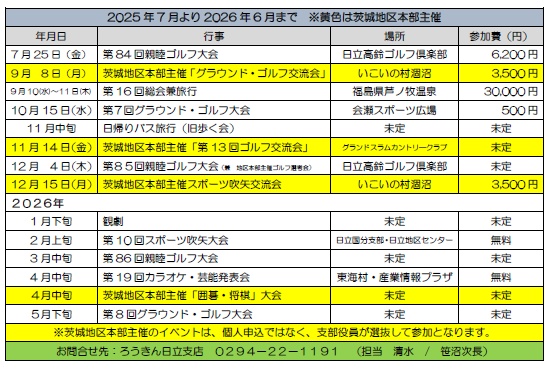 中央ろうきん友の会日立支部 2025年度行事予定一覧(2025年9月12日現在)