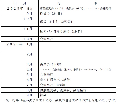 ※ 行事日程が決まりましたら、会員の皆さまにはお知らせをいたします。