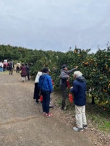 小田原・厚木道路付近からの富士山は、残念ながら上は雲で覆われ、見えたのはその下の部分だけ。トイレ休憩を挟んで最初の訪問先のみかん狩り園へ(オーランジェ)とはオランダ語でオレンジの意味のこと。各人、網とハサミをもらって詰め放題、平均20個くらい!? 酒造の見学と試飲もしました。