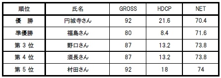 ・当日は朝から猛暑日でしかも河川敷コースのため日陰のない状況でも、元気よく全員無事にホールアウト出来ました。成績ベスト5は下記の通りです。