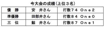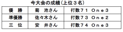 全員の方が97打以内となり、約半数の方が80打を切りました。今回も、参加者の皆さんの協力をいただき、無事に開催できました。お疲れさまでした。