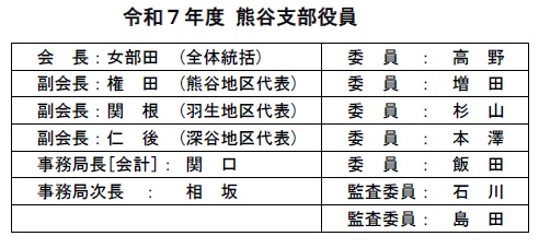 【基本方針】熊谷支部は統合され2年目を迎えます。今年も会員相互の親睦と交流を深めるため、熊谷支部の全体活動の開催と地区別(熊谷・深谷・羽生)に同好会活動として進めます。各イベントを通じ会員の皆さまが健康で明るく元気に過ごせることを目指します。