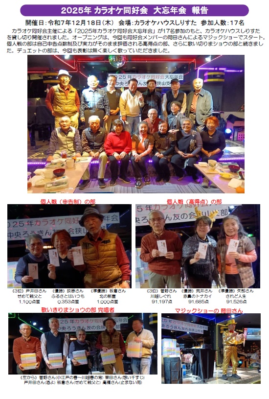 毎年恒例のカラオケ同好会の歌い納め忘年会は、会場を外部のカラオケスナック「あ・うん」さんをお借りして12時から5時間、歌好き会員18名が飲んで食べて大いに歌いまくりました。