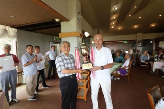 プレー終了後は2階レストランで表彰式を行いました。まず順位発表前にドラコン賞、ニアピン賞を獲得した方々に賞品を手渡し、その後新ペリア方式で実施した成績により、飛び賞や会長賞、支店長賞等の賞をそれぞれ受賞者に手渡しました。最後に今回優勝しました「岡さん」に会長から優勝カップと賞品を手渡しました。尚、準優勝は「薄井さん」、ベスグロ賞は「大槻さん」でした。