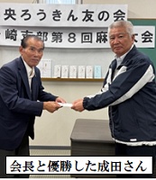 第3回大会から連続して参加されている「成田」さんが、連続4回トップをとり、2位と80点以上の差をつけて2回目の優勝を飾りました。また、今回は麻雀には参加しないと言っていた篠原会長が、1名欠席が出て急遽参加されチャッカリ第7位で「支店長賞」を受賞する等楽しいひと時を過ごしました。