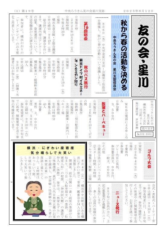 4月下旬から5月上旬頃に会員の方に、春の日帰りバス旅行、横浜にぎわい座寄席鑑賞等が掲載されたニュースを発行し参加者の募集をします。